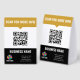 Promote your business with a practical QR code to easily access your website and get information about your business by personalizing this paper table tent sign in a clean and timeless black and yellow design with your QR code at the center. Personalize further with your business logo and contact information.