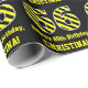 This fun, attention-grabbing, birthday-themed wrapping paper design features a large number "66", with a black and yellow striped pattern. It also features the message "Happy 66th Birthday,", and a personalised name. The background is coloured black. Fun wrapping paper like this might be used when wrapping presents being given to somebody in celebration of their 66th birthday. [~Z0000381]