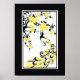 Black, yellow peacock and cherry blossoms custom poster print, featuring a black, yellow silhouette of a peacock bird and a cherry branch -sakura tree- with lovely flowers on white background with a black border around it. An elegant design with an oriental Asian flair.