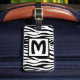 luggage tag with leather strap: square framed monogram on black and white zebra patterned background