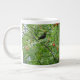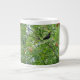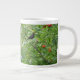 This awesome mug features a photograph of a blackbird sitting in a tree. Hanging from the tree are groups of bright red berries. This photo was taken during the height of summer.