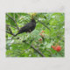 This lovely postcard features a photograph of a blackbird sitting in a tree. Hanging from the tree are groups of bright red berries. This photo was taken during the height of summer.