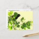 This postcard features a red-winged blackbird on a branch way up in an aspen tree. He is peeking out from behind the golden green leaves. The sky has a very pale yellow tinge.