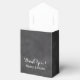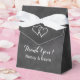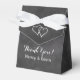 Custom chalkboard wedding party bow knot favour box with personalised text for thanking guests. Custom thank you message from bride and groom. Blackboard background image print with stylish handwritten typography. Includes elegant white ribbon bow. Customisable text template. Trendy vintage theme design with entwined double love heart. Pretty accessories for fancy wedding, anniversary, happy engagement or bridal shower. Black and white colour scheme. Change quantity to get the cheap bulk price. Tent shape favour boxes.