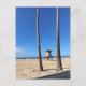 View of the famous local surf spot "Blackies" from the parking lot in Newport Beach, California. The lifeguard Tower 22 in between 2 palm trees. Back in 1953, William "Blackie" Blackstock opened the dive bar, Blackies by the Sea. Since then, locals have called this beach "Blackies", and it is a popular surf spot for long boarders and beginners. Photo taken November 2022.