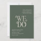 Modern wedding invitation featuring a minimal layout with "We Do" in bold typography in the middle. All design elements are in dark moss green and ivory and may be changed in the design editing tool. This simple yet elegant wedding invitation is great for an informal or formal wedding.