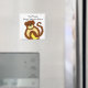 A funny magnet with a cool looking monkey holding bananas.  A funny saying... " the monkey always takes the blame"