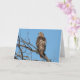 A photograph of a red tailed hawk perched on a branch with a bright blue sky in the background.