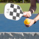 This pretty pickleball paddle is ready to be personalized with a name in black script style lettering. The paddle has a pattern of painted black squares and plain white squares arranged in a checkerboard pattern. The pattern appears on both sides with the name on one side of the paddle.