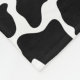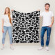 This fleece blanket has a very large print of a black and white spotted cow print.
