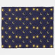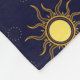 Front view: Blanket with deep blue background featuring a repeating pattern of yellow suns and crescent moons. Back view: Plain white fabric.