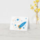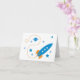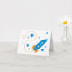 A colourful, retro rocketship soars through outer space, past stars and a planet. Especially fun for a birthday card or party invite.