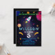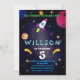 Fun and colourful space-themed birthday invitation design featuring rockets, planets, meteors, and vibrant cosmic details. Perfect for kids' parties and celebrations. This template can be customised to include the child's name, age, date, time, and RSVP details, making it an exciting way to invite guests to your special day.