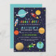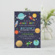 Celebrate your son's special day with these cute space-themed birthday party invitations. This design features your custom party details in colourful, modern typography and a frame of planets, stars, rockets and more against a navy blue sky. These cards reverse to a blue background. Edit the text in the template boxes to customise.