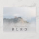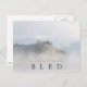 Postcard of historic Bled castle, built upon the rocks along Lake Bled, surrounded by clouds and ground fog, like it is a castle built in the sky, in Bled, Slovenia with the text 'Slovenia, BLED'.