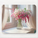 A clear Mason jar holds a vibrant bouquet of pink and white bleeding heart flowers, basking in the soft sunlight streaming through a window