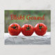 Bleibt Gesund mit drei rote Tomaten auf einer weißen Mauer vor grüner Natur