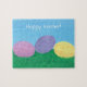 These puzzles feature my painting of three Easter eggs laying in the grass. The eggs are blended; there is one each of pink, lavender, and yellow. They sky is pale blue and the text, Happy Easter, is written across the sky in white. The text can be easily customised on the template form. Thank you for shopping CherylsArt on Zazzle.