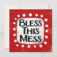 "Bless This Mess" is a cute text design in red with black text, along with a white accent shape and white textured whimsical dots surrounding it.