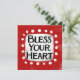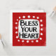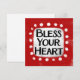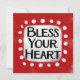 "Bless Your Heart" is a cute text design in red with black text, along with a white accent shape and white textured whimsical dots surrounding it.