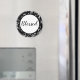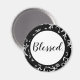 This Christian inspired magnet features a white and black damask print border with the word "Blessed." in a modern black script atop a white circle with black border. Leave as is or personalise to your liking. Makes a lovely gift for Christian family and friends.