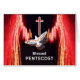 Blessed Pentecost with Bible scripture from Acts 2 printed inside, paper greeting card. Digital illustration of a white dove flying upwards towards a red cross. Fire and light symbolising the spirit of God fills in the sides of the image. Art, image, and verse copyright © Shoaff Ballanger Studios, 2023.