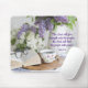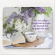 A vase of lilac, glasses, book, and a cup of tea, a calming image with words from the Bible "The Lord will give strength unto his people;