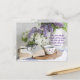 A vase of lilac, glasses, book, and a cup of tea, a calming image with words from the Bible "The Lord will give strength unto his people;