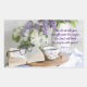 A vase of lilac, glasses, book, and a cup of tea, a calming image with words from the Bible "The Lord will give strength unto his people;