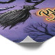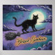 This whimsical poster features a black cat with glowing green eyes riding a broomstick under a full moon, framed by dark clouds and flying bats, symbolising mystery and Samhain's magic. Finished as an oil paint art print.