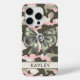 Customize this blingy pink, green and cream camouflage iPhone 15 pro case with an olive green satin bow with a diamond center and your name in a trendy modern CAP font in dark green on cream. It's so girly, blingy and chic! Perfect for any country girl!