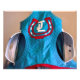 A blue and white racing blinkers at the Joe Mazza stables in Belmont Park. The blinkers are embroidered with the owner's emblem of a horse shoe with the letters "JL" inside the shoe. Fleetphoto