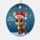 Blitzen! Cute animal reindeer character, baby deer with antlers and personalizable Santa hat with festive blue snowy backdrop. Unique winter wildlife graphic with a light snow. Round ceramic ornament, with customizable Merry Christmas written in white. for decorating your holiday tree or as a thoughtful gift, this whimsical woodland doe decor makes a cherished keepsake for years to come. Customize by changing the text, the font, the font color, or remove the text. You can even transfer this cartoon fawn illustration onto other products. Enjoy this design your way! 🎄🦌