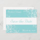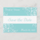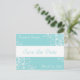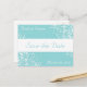 Save the date postcards, with white scrolls on a robins egg blue background. Enter your information in our easy-to-use template. Get the matching save the date postage to complete the look.