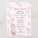 Blonde Baby Girl with Teddy Bear Baby showier invitations with pink and white polka dots and bows.