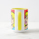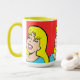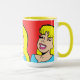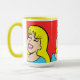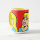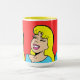 This Blonde Bombshell Comic Strip Coffee Mug features a repeating comic style drawing of a beautiful, blonde girl on a red background. She has a button nose, full pink lips and the brightest of smiles. Her eyes are closed, probably due to the weight of her lush, black lashes. She has a thick fringe of bangs and flowing yellow hair that extends past her shoulders. Her aqua shirt is barely visible at the bottom of the design. She looks as if she doesn't have a care in the world. And, really, she shouldn't have a care in the world. After all, she is a cartoon.