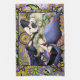 Blonde fairy wearing purple and red in a floral geometric pattern of green, ornage, lavender and pink,