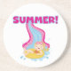 A cute design for summer, features a blonde haired girl in bathing suit and ring coming down the water slide and hot pink and blue text that reads SUMMER! Summer T-shirts, bodysuits, bibs, mugs, cards, bags, stickers, keepsakes, pillows, and much more.