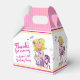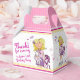 Bright graphic pink with scallop stripes and graphic blonde hair girl holding a lucky white bunny rabbit and gift, thank you favour birthday gift boxes. Ideal for your girls birthday favours. Personalise with your own name and birthday age. Currently reads Thanks for coming to Justine's 9th Birthday Party. Original art and design by Sarah Trett.