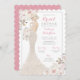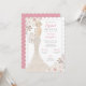 Glamourous bridal shower invitation features a bride in a sparkly, lace wedding gown and adorned with watercolor flowers in pink and white. Several options available for bride’s hair and skin tone.