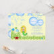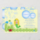 This 5x7 birthday party invite has a blonde mermaid, a red crab, and three fish swimming under the sea. There is a blue starfish also hiding in the seaweed. Many bubbles are floating around as well. There are three large bubbles that you can customise with your child's name and age. The party information, which is easily personalised, is below the large bubbles.
