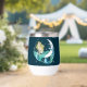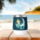 A blonde haired mermaid on a crescent moon with a teal coloured tail with water, water bubbles and stars all round. All drawn in a an art deco style4.