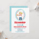 This boy's birthday invitation features a cute blonde boy holding a pizza, wearing a chefs hat, apron and blue jeans with red t-shirt. Perfect for a pizza party.