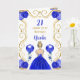 This birthday card invitation features an elegant gold frame, a beautiful princess with blonde hair and a royal blue dress, flowers and a balloon.
