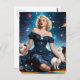 A vintage looking blonde woman in a dress with stars all over it and three white cats floating in the stars fantasy AI generated art
