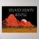 Digital design of a blood moon rising up from behind the mountains. Bats and a lone buffalo accent the image.