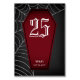 Goth wedding table cards in dark grey and deep blood red with pale spiderweb, the table number in a gothic font against a deep red coffin shape. Add your initials and wedding date too.