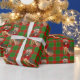 An adorable watercolor illustration of a Bloodhound, pairs with a cheerful red and green holiday plaid patterned background, and the dog wears a red scarf and adorable elf hat.