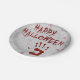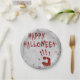 Scary horrific Halloween illustration featuring a bloody handprint and blood splatter on a grungy background.