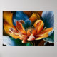 A vibrant flower unfolds in a spectacle of colours, where fiery orange and golden petals dance against cool shades of blue. The artwork radiates energy, delicacy, and renewal, as if nature reveals its poetry in every detail.